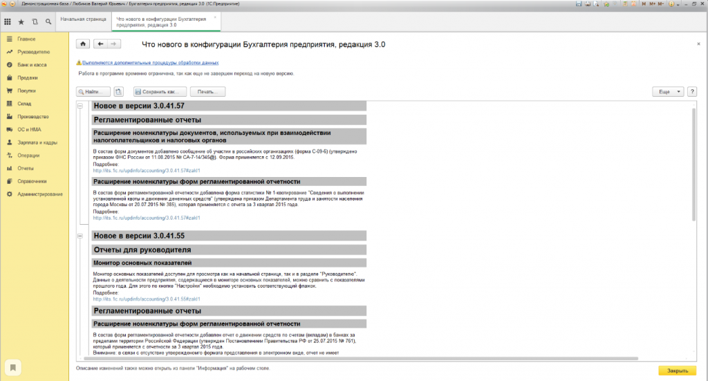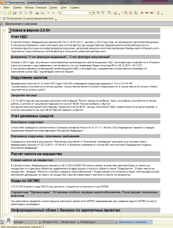 После того, как обновление завершится, запустится 1С и откроется окно «Дополнения к описанию», где будут перечислены, вышедшие обновления: