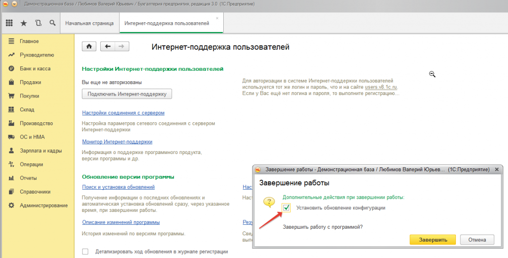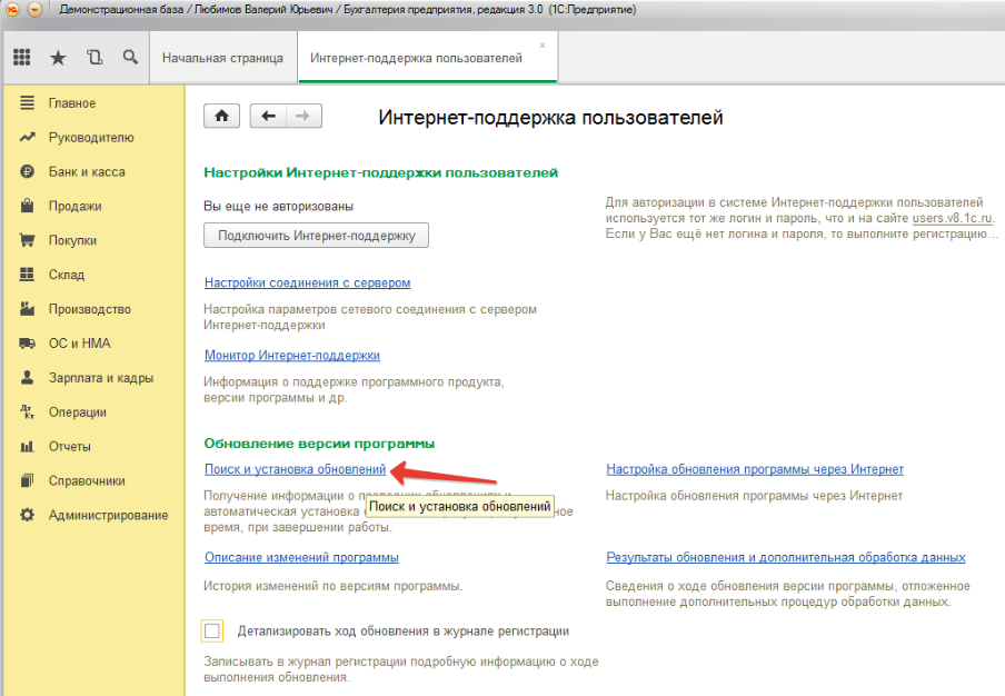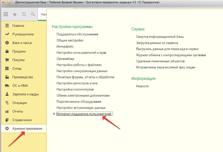Для обновления необходимо выбрать пункт панели разделов «Администрирование->Интернет-поддержка пользователей»: