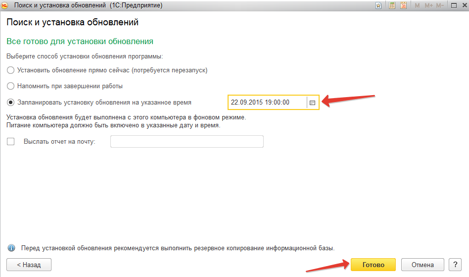 Если вы выбрали способ установки «Запланировать установку на указанное время», тогда вы можете ввести желаемое время установки обновления и нажать «Готово»: