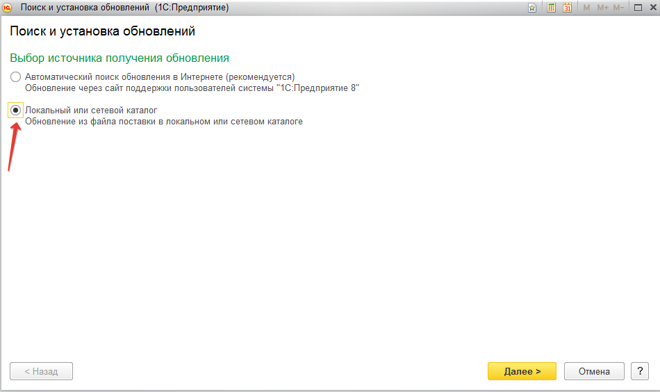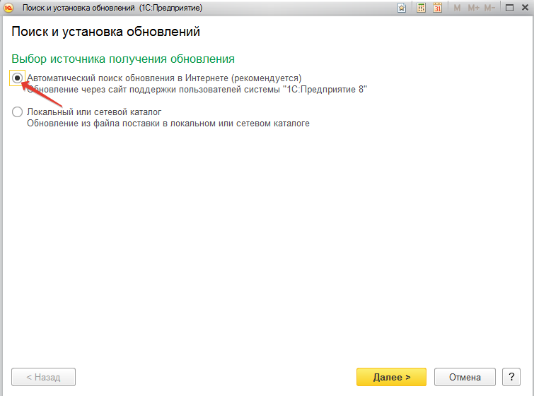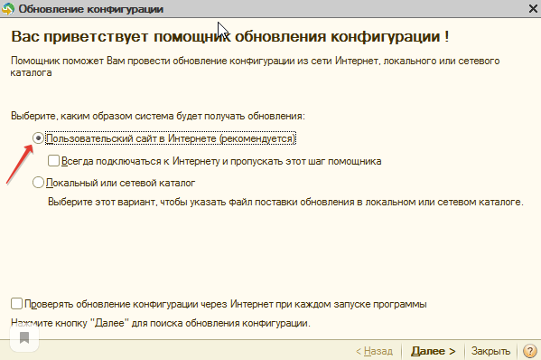 Далее откроется окно помощника обновления конфигурации, в котором вы можете выбрать, каким образом конфигурация будет получать обновления: