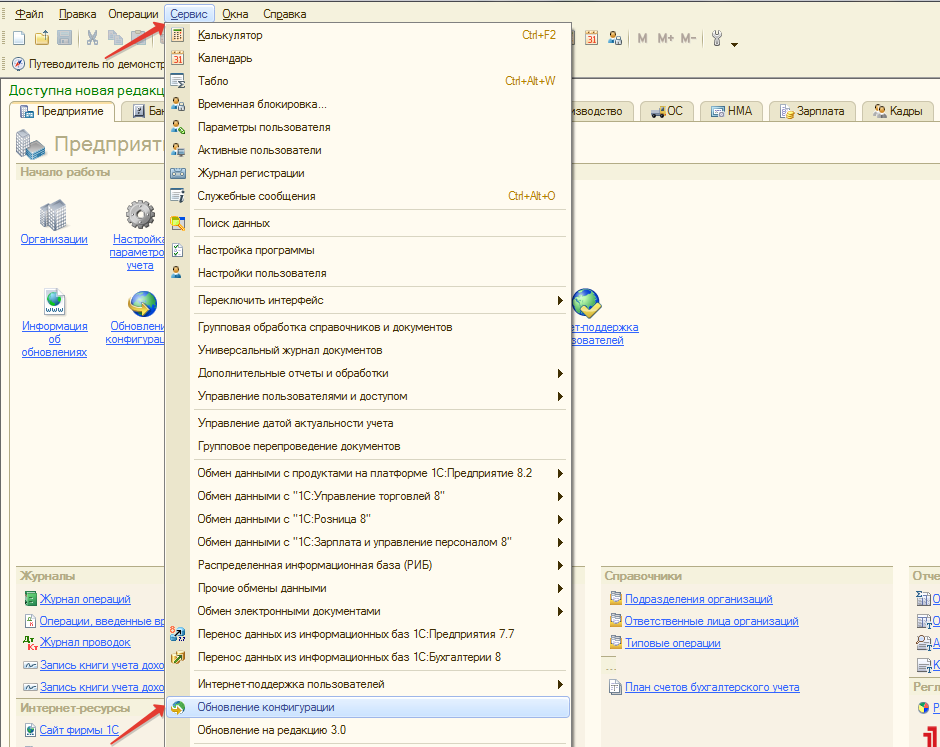 Для обновления необходимо выбрать пункт главного меню «Сервис -> Обновление конфигурации»: