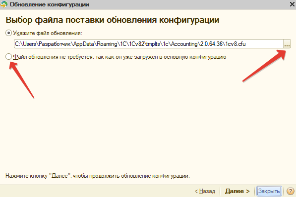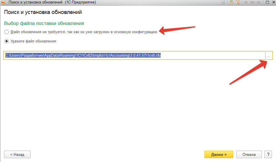 Данный вариант подразумевает, что у вас уже скачаны файлы обновления и находятся на вашем локальном компьютере или в общей папке в локальной сети. В появившемся окне, необходимо выбрать путь к файлу с расширением *.cfu из каталога обновления (вариант «файл обновления не требуется, так как он уже загружен в основную конфигурацию», подразумевает, что ранее файл был скачан и загружен в конфигурацию, но изменения не были применены):