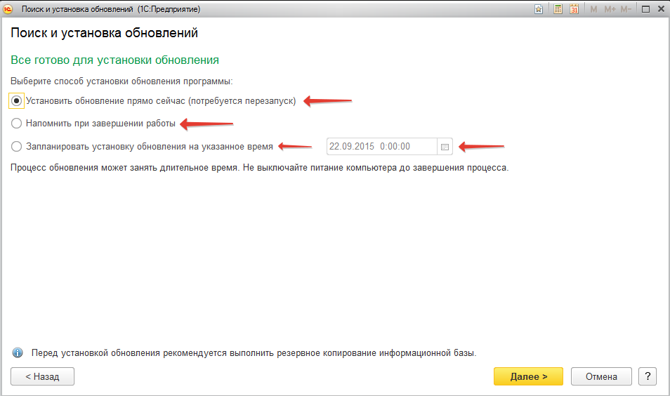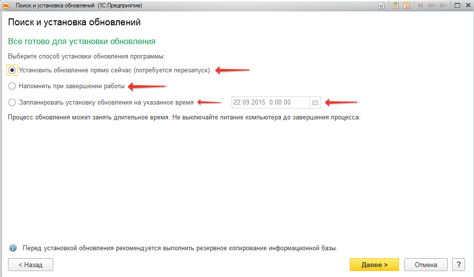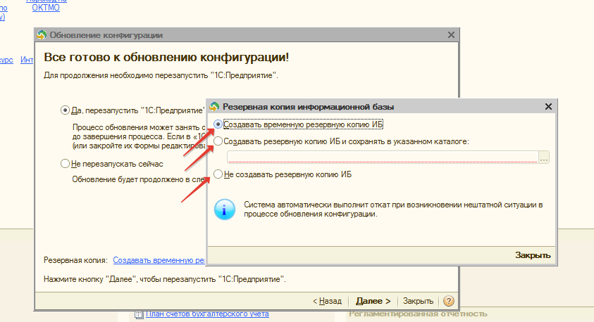 - Не создавать резервную копию ИБ (в этом случае, при сбое копия не будет создана, и вы не сможете «откатиться» назад до начала обновления):