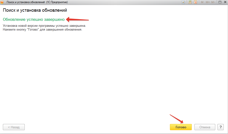 После того, как обновление завершится, запустится 1С и откроется окно: