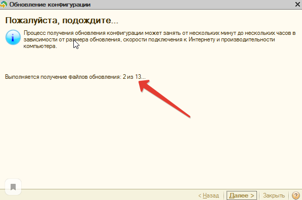 После того, как вы выберите необходимый вариант сохранения копии ИБ, нажимаете кнопку «Закрыть» и в помощнике обновления нажимаете кнопку «Далее». Система выполнит перезапуск и начнется процесс обновления: