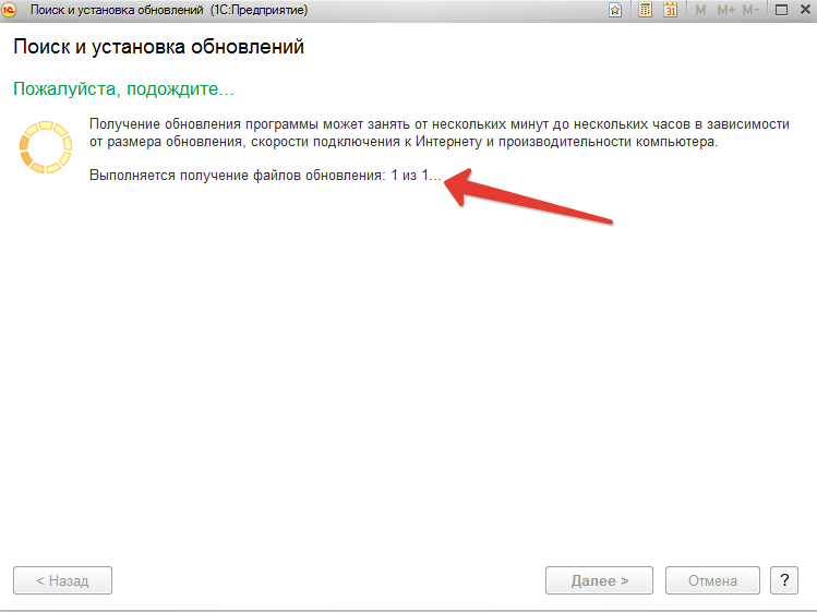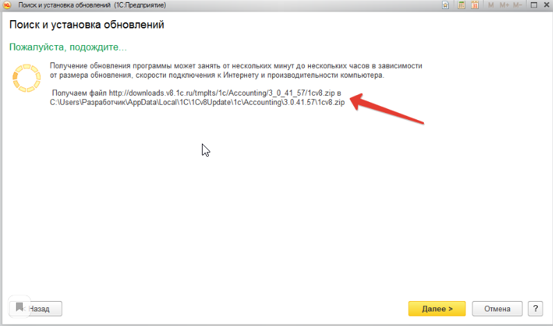 Данный режим подразумевает прямое подключение к официальному сайту 1С, где автоматически происходит загрузка и установка обновления. Если выбрать этот вариант и нажать кнопку «Далее», система проверит наличие обновления и, если оно будет найдено, то появится такое окно с информацией по обновлению: