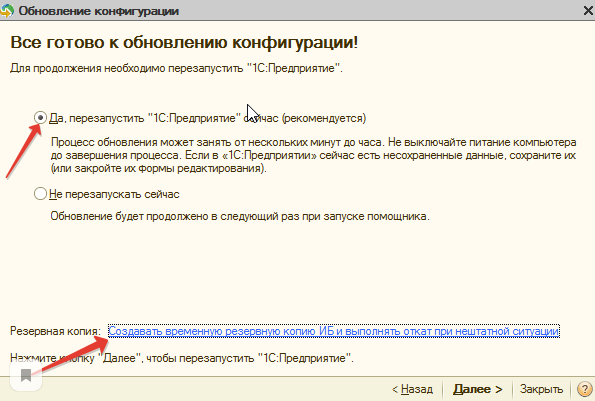 Появится окно, где вам будет предложено перезагрузить 1С для продолжения процесса обновления, также рекомендуется создать резервную копию базы, в случае сбоя и возможности произвести откат назад, до состояния обновления:
