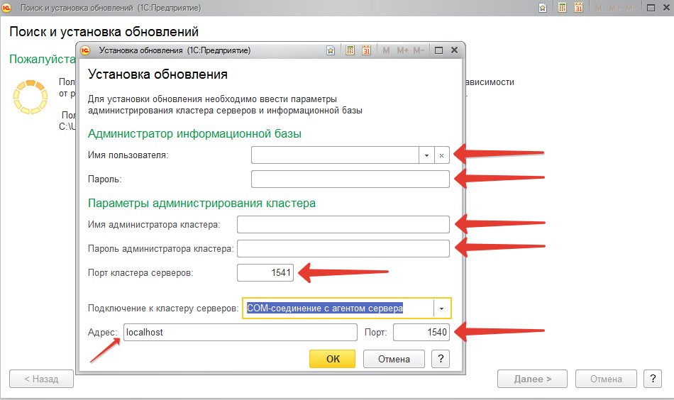 Если у вас клиент-серверный вариант информационной базы, тогда появится окно, где вам потребуется ввести данные пользователя с правами «Администратор системы», а также данные администратора кластера серверов (если Администратор кластера был создан). Указать порт кластера серверов, адрес сервера и порт: