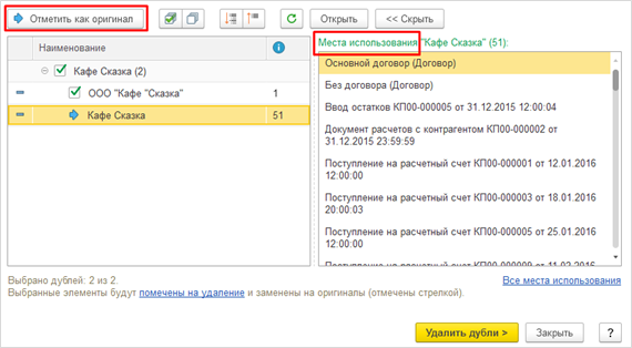 Элемент, у которого будет больше связанных объектов, автоматически будет отмечен как оригинал и все ссылки будут перенесены на него. Если оригиналом должен быть другой элемент, то его можно поменять по кнопке «Отметить как оригинал».