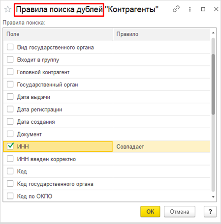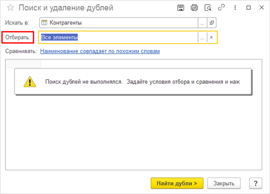 В поле «Сравнивать», нажав на ссылку, необходимо указать параметры поиска данных, а именно, по какому реквизиту программа будет считать элементы дублями.