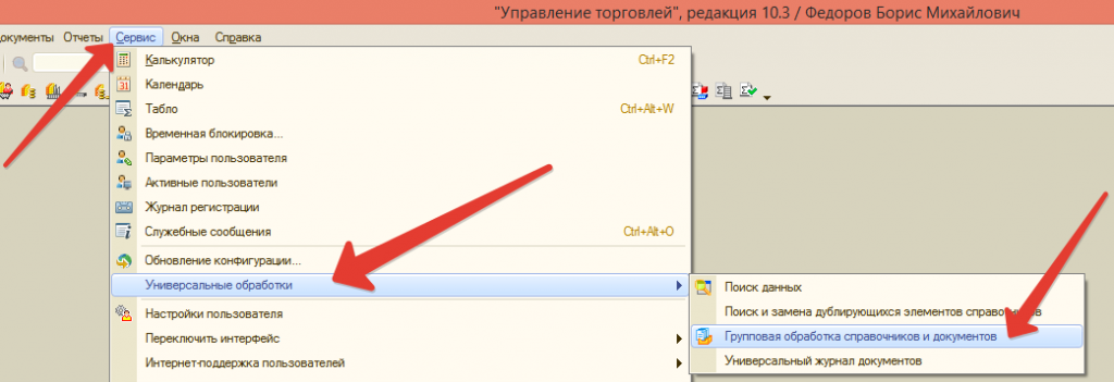 Открыть обработку можно с помощью команды главного меню «Сервис- Универсальные обработки- Групповая обработка справочников и документов» (рис. 1).