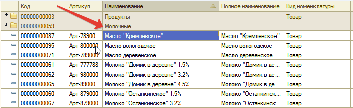 Пример 1. Требуется из группы номенклатуры «Молочные» перенести все молоко (номенклатуру, содержащую в названии слово «молоко») в отдельную группу «Молоко» и аналогично масло (номенклатуру, содержащую в названии слово «масло») в отдельную группу «Масло» (рис. 5, рис. 6)