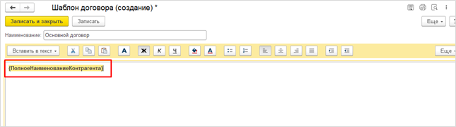 При создании нового шаблона необходимо указать, каким будет наименование этого шаблона, далее приступить к заполнению текста шаблона. Для удобства пользователей, помимо ввода текста, доступна возможность сделать ссылки на некоторые элементы информационной базы, настраивается это через кнопку «Вставить в текст» и задается определенный параметр, который выделяется фигурными скобками, цветом и жирным шрифтом. При формировании печатной формы договора фигурные скобки будут замены на соответствующие данные. В примере по созданию нового шаблона использовался такой параметр как «Полное наименование контрагента».