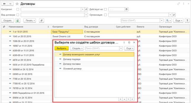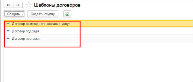 В открывшемся окне будут доступны три варианта предопределенных шаблонов: «Договор возмездного оказания услуг», «Договор подряда» и «Договор поставки», которые содержат в себе определенные данные и реквизиты, готовые к распечатке.