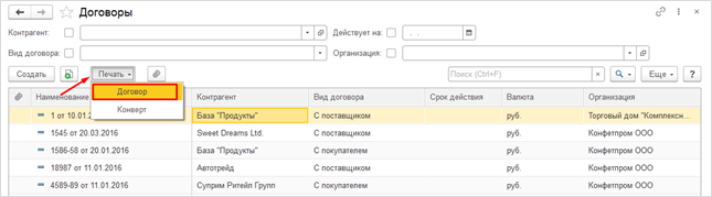 Организация взаимодействует с покупателями или поставщиками на основании заключенного договора. В связи с этим может появиться необходимость распечатать договор. Бывает даже, что требуется готовить и распечатывать однотипные договоры, изменяя только информацию по контрагентам. В программе 1С предусмотрена возможность формирования текста договоров, а также распечатка, отправка по электронной почте и сохранение в файл.