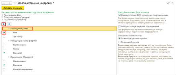 Во втором случае в форме «Дополнительные настройки», в поле «Настройка по упорядочиванию списка сотрудников» следует передвинуть переключатель «По сотруднику» на первое место при использовании стрелки, с помощью которой и будет выполнена сортировка.