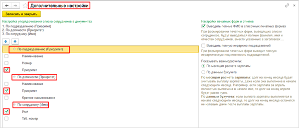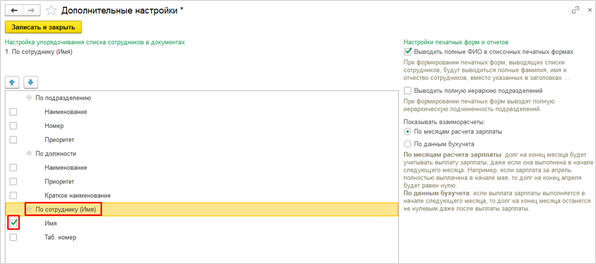 В первом случае, в форме «Дополнительные настройки», в поле «Настройка по упорядочиванию списка сотрудников» требуется оставить включенным флажки только «По сотруднику (Имя)», а по сортировке подразделения и должности снять.