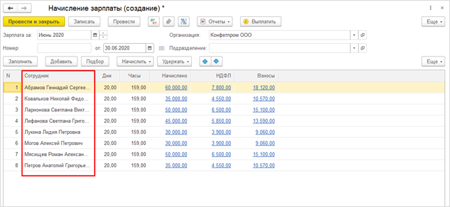 Для того, чтобы сохранить выбранный вариант настройки, следует нажать на кнопку «Записать и закрыть». Проверим работу данной настройки на примере документа «Начисление зарплаты».