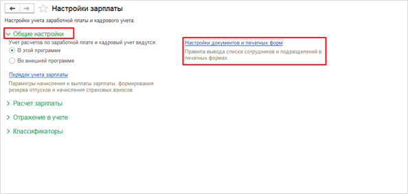 Далее следует раскрыть список «Общих настроек» и перейти по ссылке «Настройки документов и печатных форм».