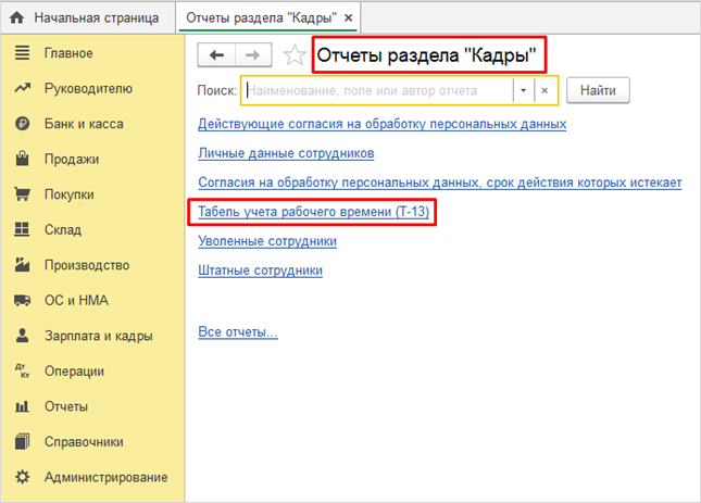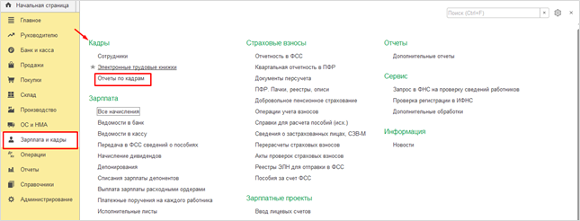 Чтобы настроить сортировку сотрудников в табеле по алфавиту, следует открыть раздел «Зарплата и кадры», найти «Кадры» - «Отчеты по кадрам».