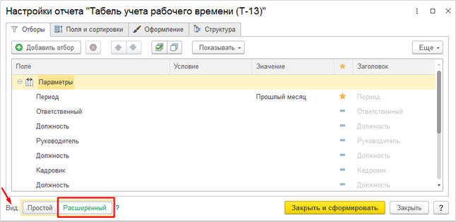 После этого открывается форма «Настройки отчета», вид настроек отчета нужно поменять на «Расширенный» и выбрать закладку «Поля и сортировки».