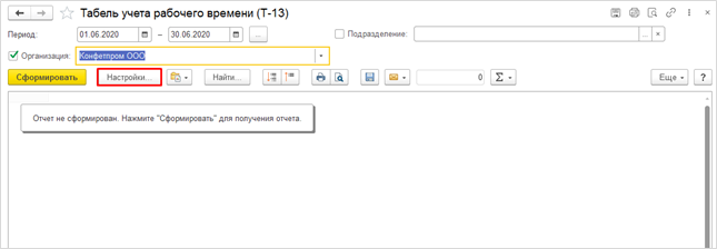 Далее необходимо перейти по ссылке «Табель учета рабочего времени (Т-13)» и в открывшемся окне задать отбор по организации (если учет ведется по нескольким организациям в информационной базе), подразделение (при необходимости), период и нажать на кнопку «Настройки».