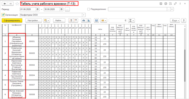 Табель учета рабочего времени (Т-13) представляет собой кадровый отчетов, позволяющий вести контроль явок и неявок сотрудников на работу, количество отработанных часов и дней, а также данные для начисления заработной платы по видам и направлениям затрат. Для «Табеля учета рабочего времени (Т-13)»,как и для других отчетов, существует список настроек, которые позволяют упростить работу пользователей. Сортировка сотрудников в табеле по алфавиту является одной из таких настроек.
