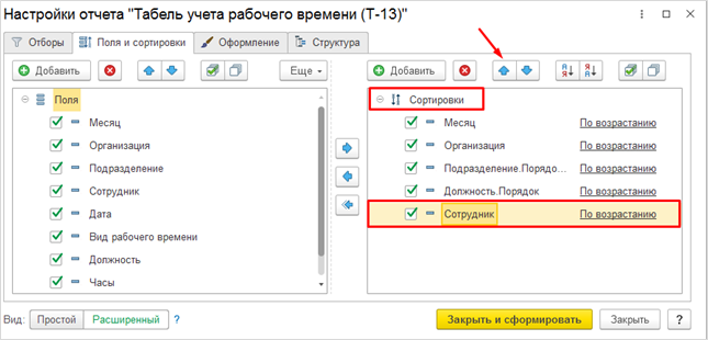 В поле справа с наименованием «Сортировка» следует переместить позицию "Сотрудник" вверх так, чтобы она оказалось перед позицией "Подразделение. Порядок (иерархический)", выполнить это можно с помощью синей стрелки. Записать настройки по кнопке «Записать и сформировать».