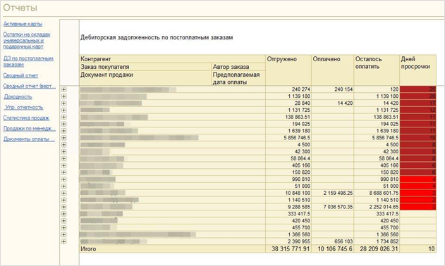 Также в качестве примера можем привести доработку рабочего стола, реализованного в программе «Комплексная автоматизация», а именно выполненную разработку отчета по дебиторской задолженности по постоплатным заказам.