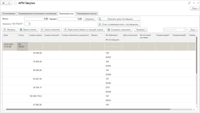 В ходе выполнения данной задачи были разработаны дополнительные формы: "Форма ввода платежа" и "Форма Платежи" для АРМ Закупки, а также Добавлены в АРМ Закупки вкладки "Взаиморасчеты" с функциями: